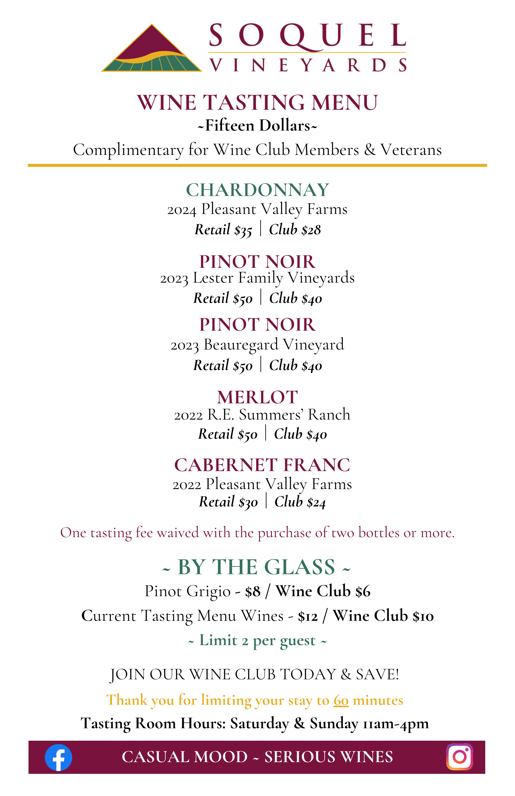 ' Current Tasting Menu - Soquel Vineyards